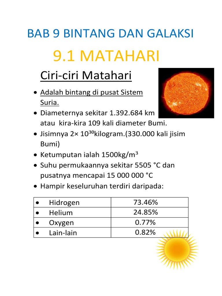 Find more similar flip PDFs like Sains Tingkatan 1. Bab 9 3 SAINS T4 POLIMER Kuiz. MATAHARI Ciri- ciri matahari Saiz diameter Jisim Ketumpatan Suhu permukaan Suhu teras Matahari Ukuran Catatan 14 juta km Diameter Matahari adalah 109 kali diameter Bumi.