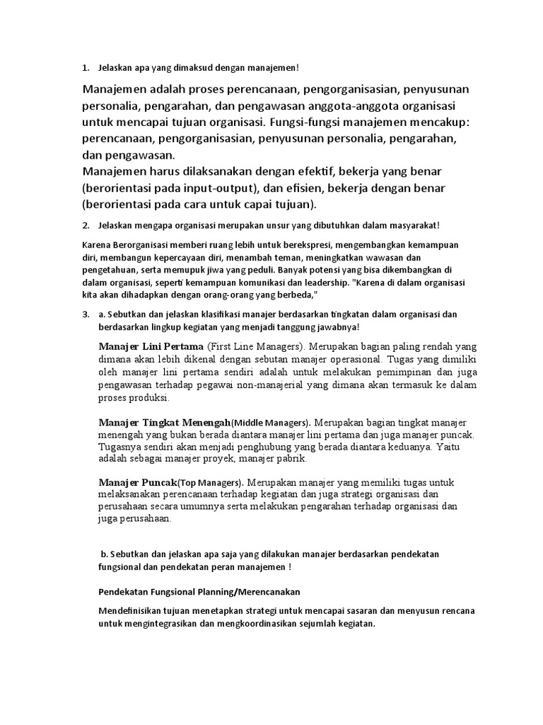 Manajemen Puncak Top Management. 17Berdasarkan sejarah perkembangan teori manajemen Tuliskan aliran pemikiran atau mahzab manajemen. 18Tuliskan unsur-unsur lingkungan external makro yang dapat mempengaruhi secara langsung terhadap.